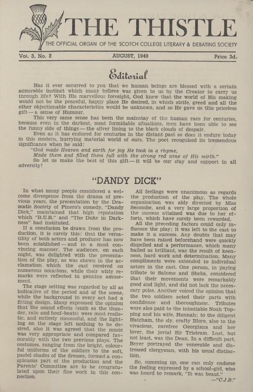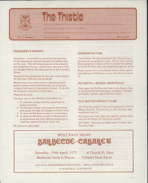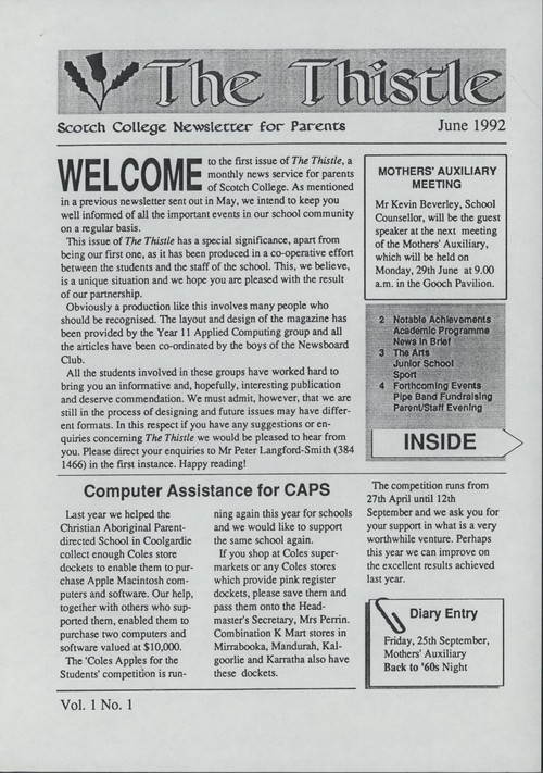You will have noticed by now that our fortnightly newsletter has had a facelift (unlike the Headmaster). The review of the newsletter was taken in order to modernize the way we communicate important information to the community but also to examine whether we could resurrect part of our history through the newsletter. This has been achieved through reinstituting the name The Thistle - a title that has previously been used for newsletters and Old Scotch Collegian communications. I have included pictorial examples provided from Archives. I trust you will find the new format assists you in staying better connected with all that we do as a community.