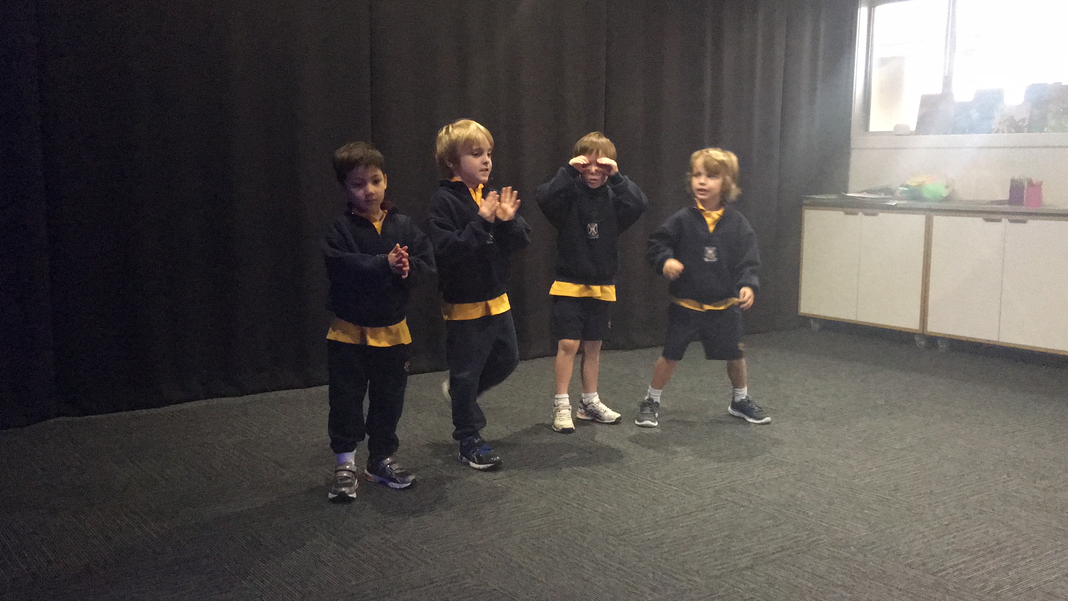 Inspired by a recent bush school experience, the Pre-Primary boys have been inquiring into different movements and sounds associated with jungles. We began by reading a few pages out of the book Jungle Days, Jungle Nights. Individually, the boys drew one picture for each of the following categories: weather, people, animals and plants. These prompted many interesting discussions as they improvised and suggested movements and sounds for each of their pictures. Next, the boys joined in groups of four to create a performance. The boys discussed performance etiquette including standing still at the beginning and end to let the audience know when it was time to be entertained, and when it was time to give a round of applause.