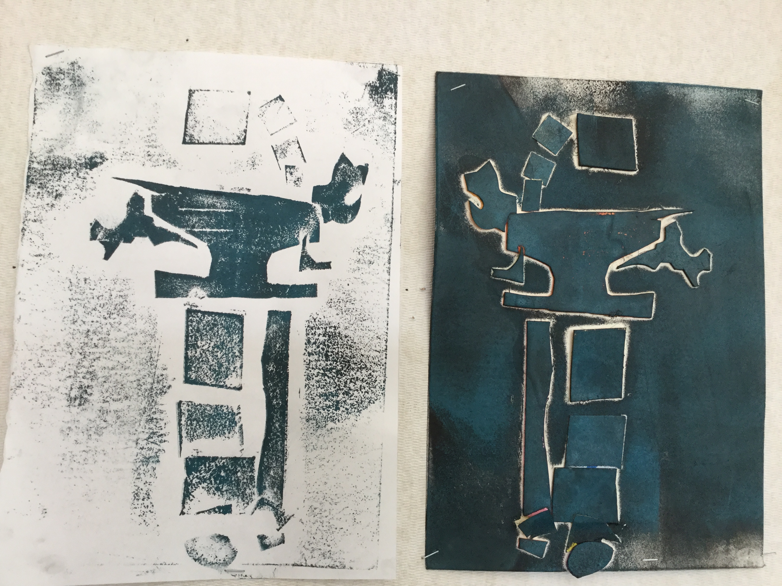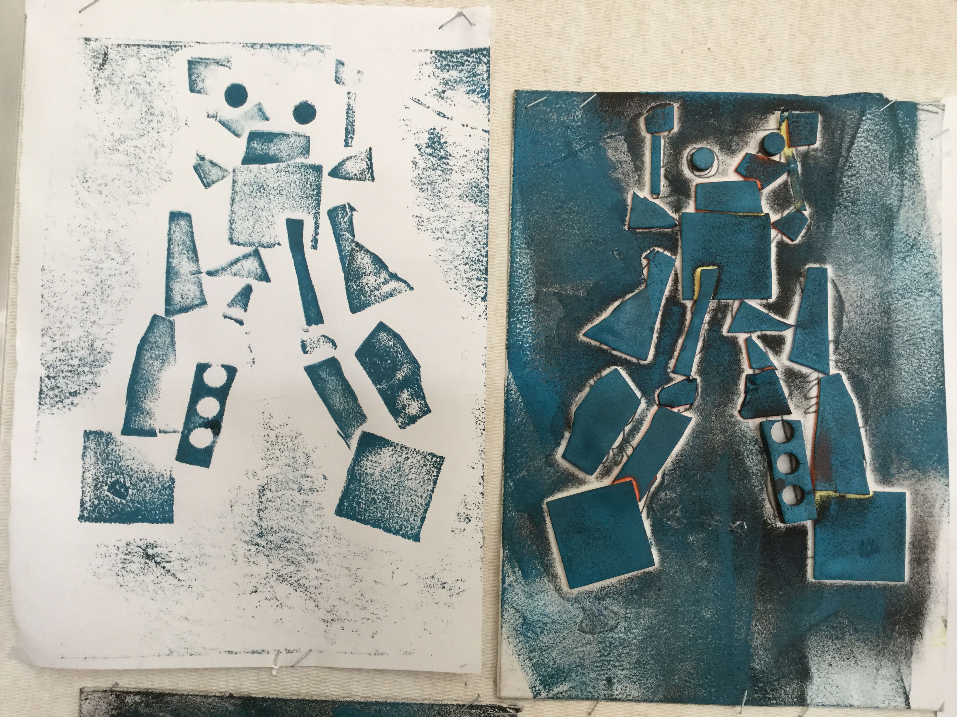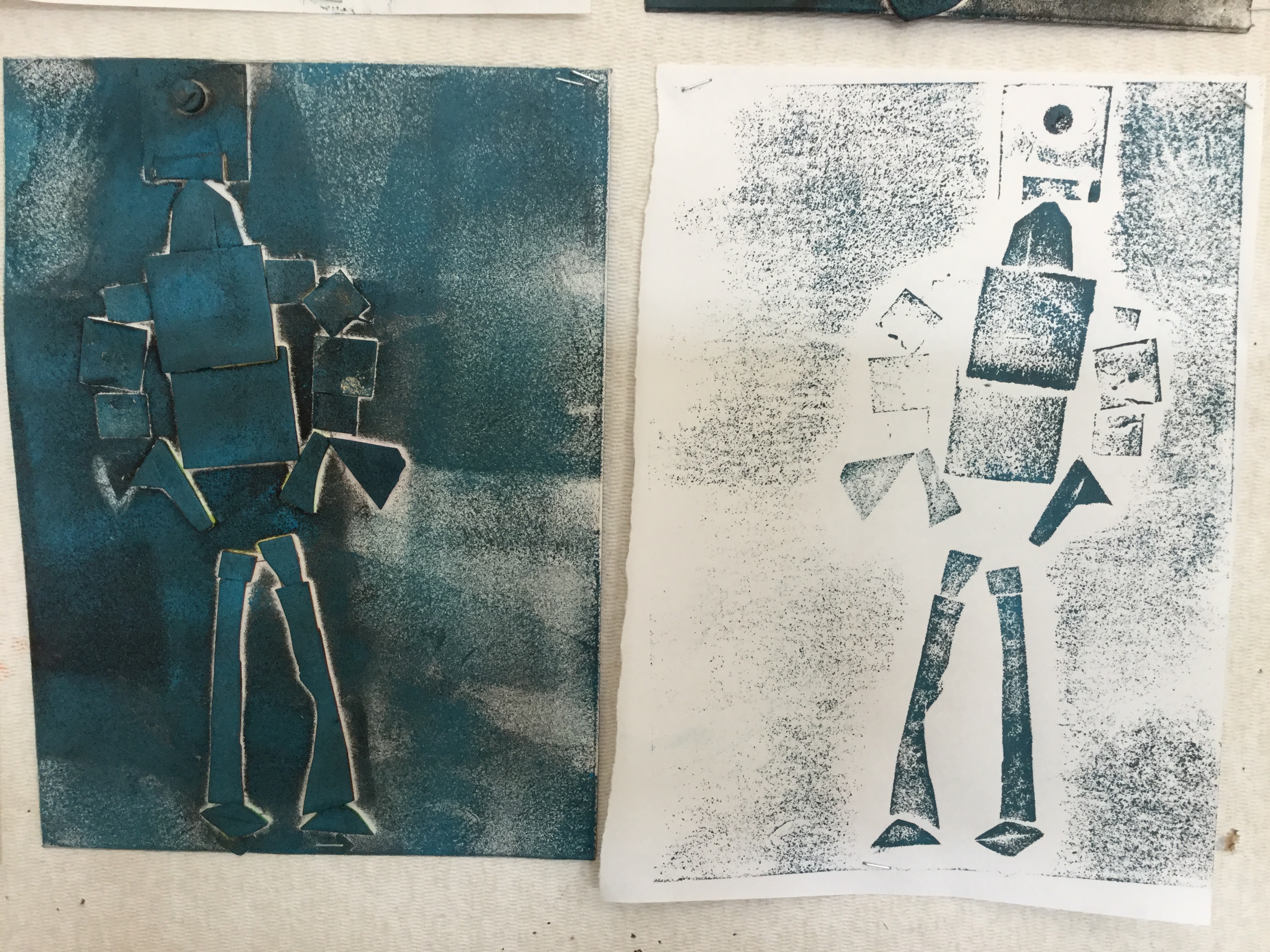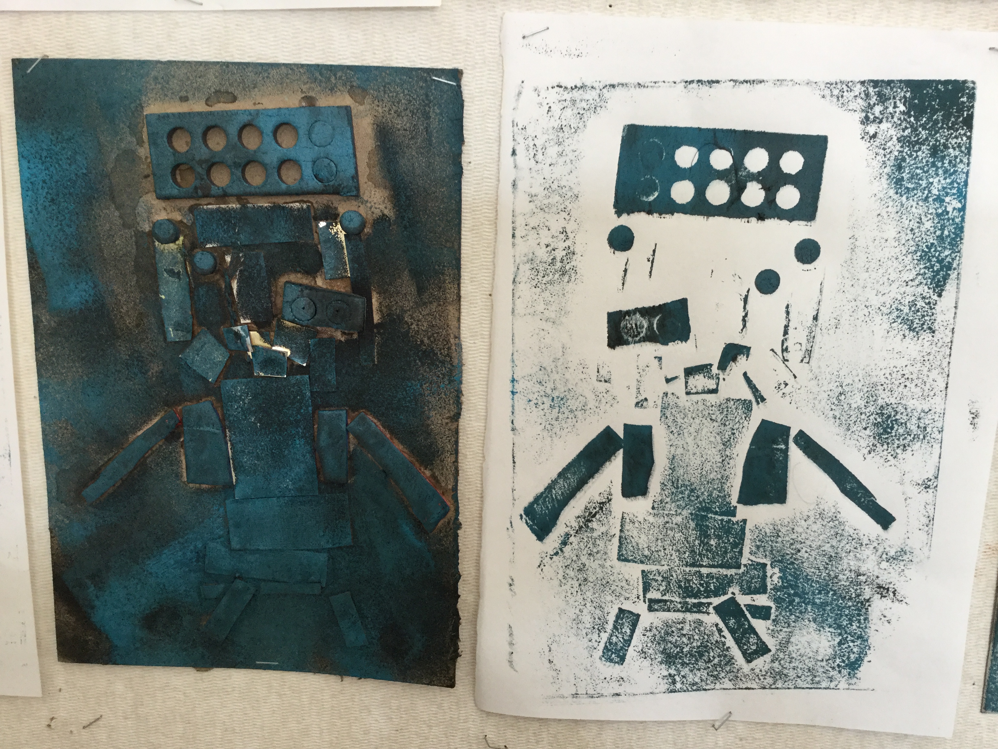 The boys were delighted with their final robot print and thoroughly enjoying each stage of the challenging process. The original Collagraph plate displayed demonstrates perfectly, the process of positive and negative relief printmaking.
