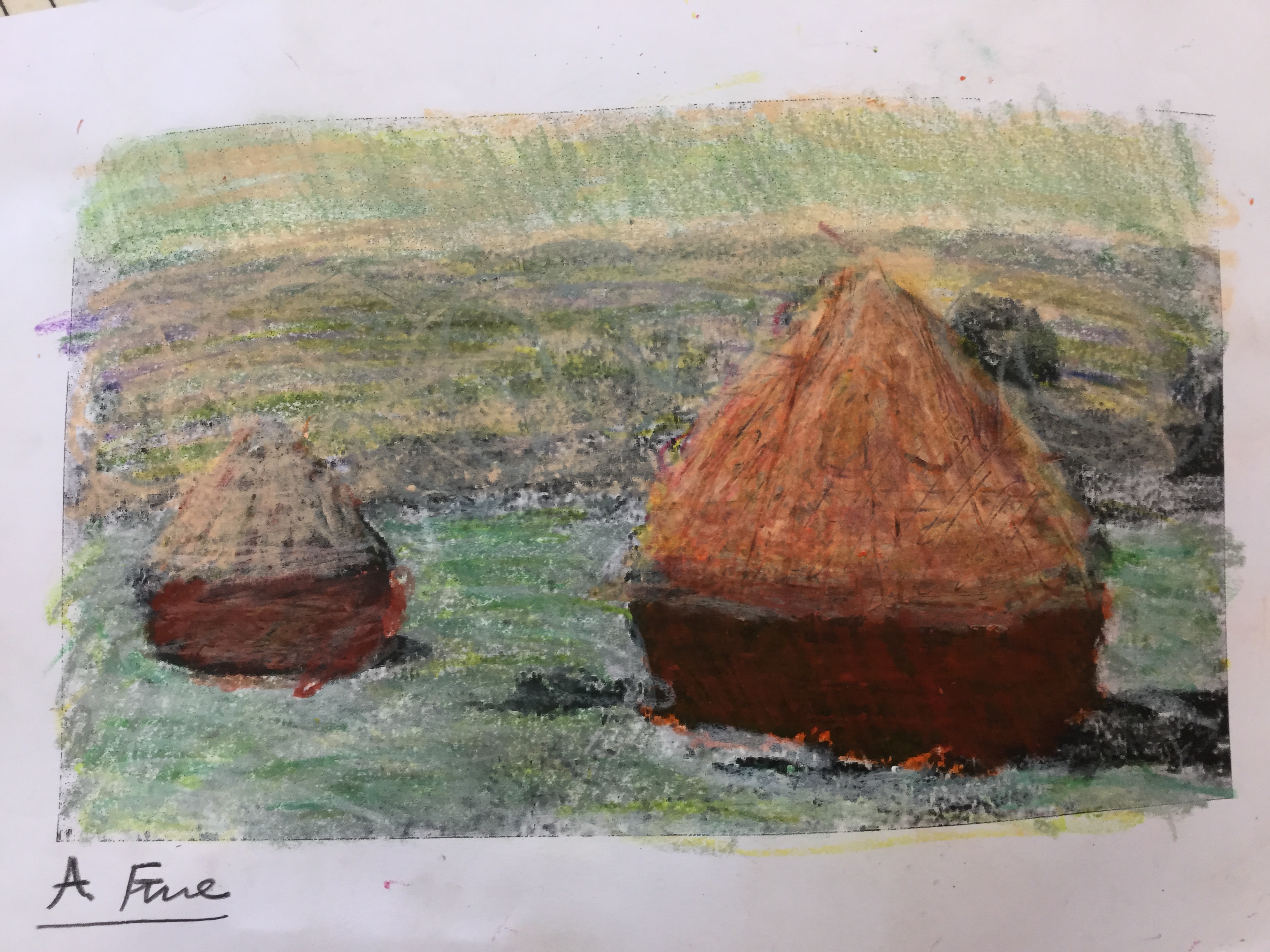 The Year 3's have been looking at the French artist Claude Monet in great detail as part of a combined Art and French unit this semester. In both lessons, we examined his biographical details, learning about where he was born and how he progressed with his art education. In French, we examined four paintings in detail - two landscape paintings and two with people in them. The boys have been revising their colour vocabulary and can now identify the colours in each painting in French. After a collection of spoken activities, the boys are now confident enough to progress onto explaining which of the four focus paintings is their favourite and will be able to explain in French how the feel of the picture appeals to them. In Art, the boys began by discussing the impressionist style in 'Bridge over a Pond of Waterlilies'. They then each created a mixed media watercolour. Firstly, the boys used tape to mark out the bridge and then layered their watercolor paints. Through experimental risk-taking, they applied a delicate salt technique, creating unexpected textures. In their following session, the boys worked over a black and white master copy, applying water soluble oil pastels to imitate the rich seasonal colours of Haystacks and End of Summer. The results were outstanding, displaying a variety of inspired outcomes.