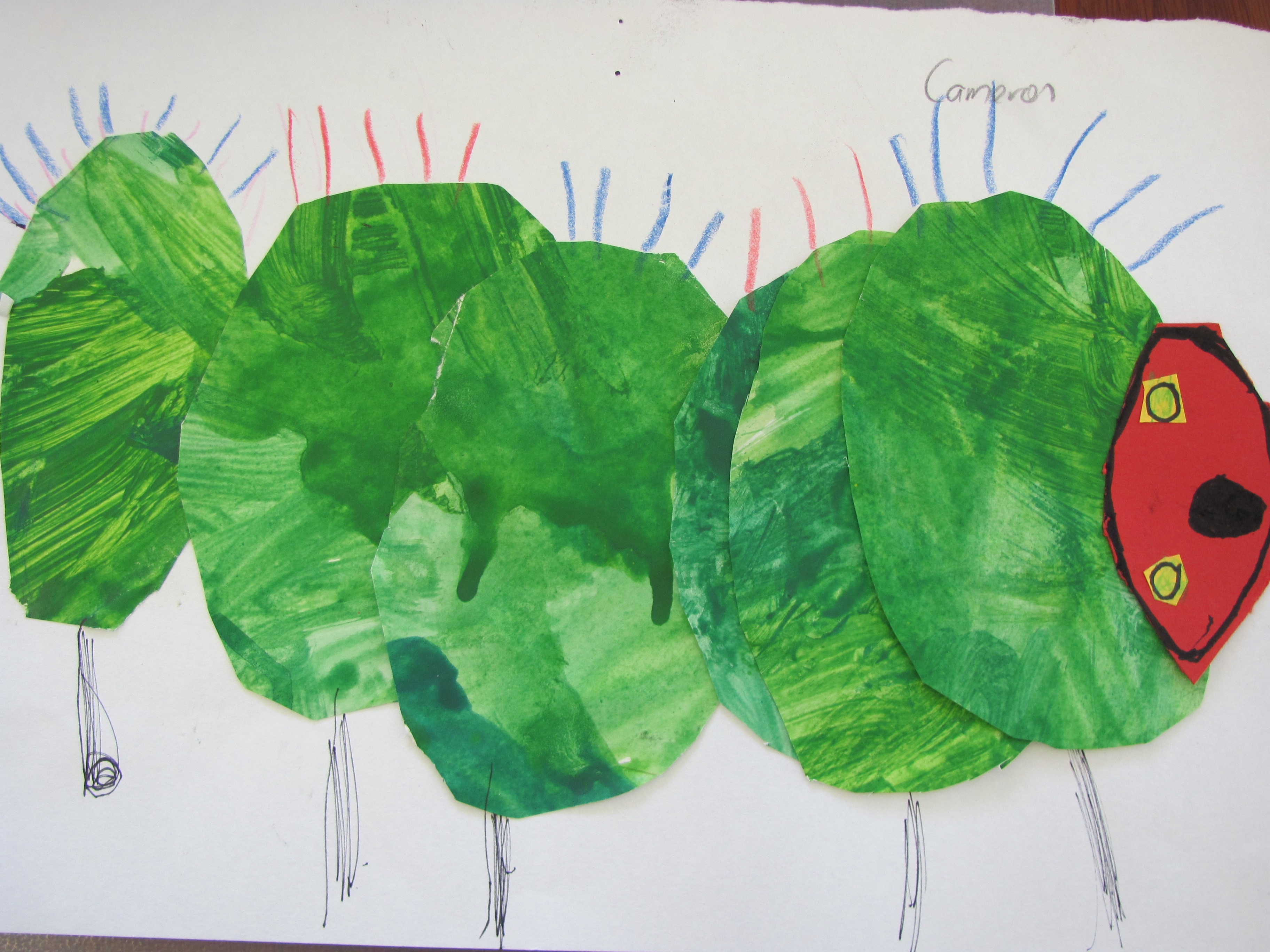 The Very Hungry Caterpillar, written and illustrated by Eric Carle was a wonderful source of inspiration for the Pre-Primary artists. After reading the story and many other colourful illustrated tales by Eric Carle, the boys had the opportunity to create their own collage caterpillars. Working in the lively style of Carle, they each created their own painted papers to use within their collaged artworks.