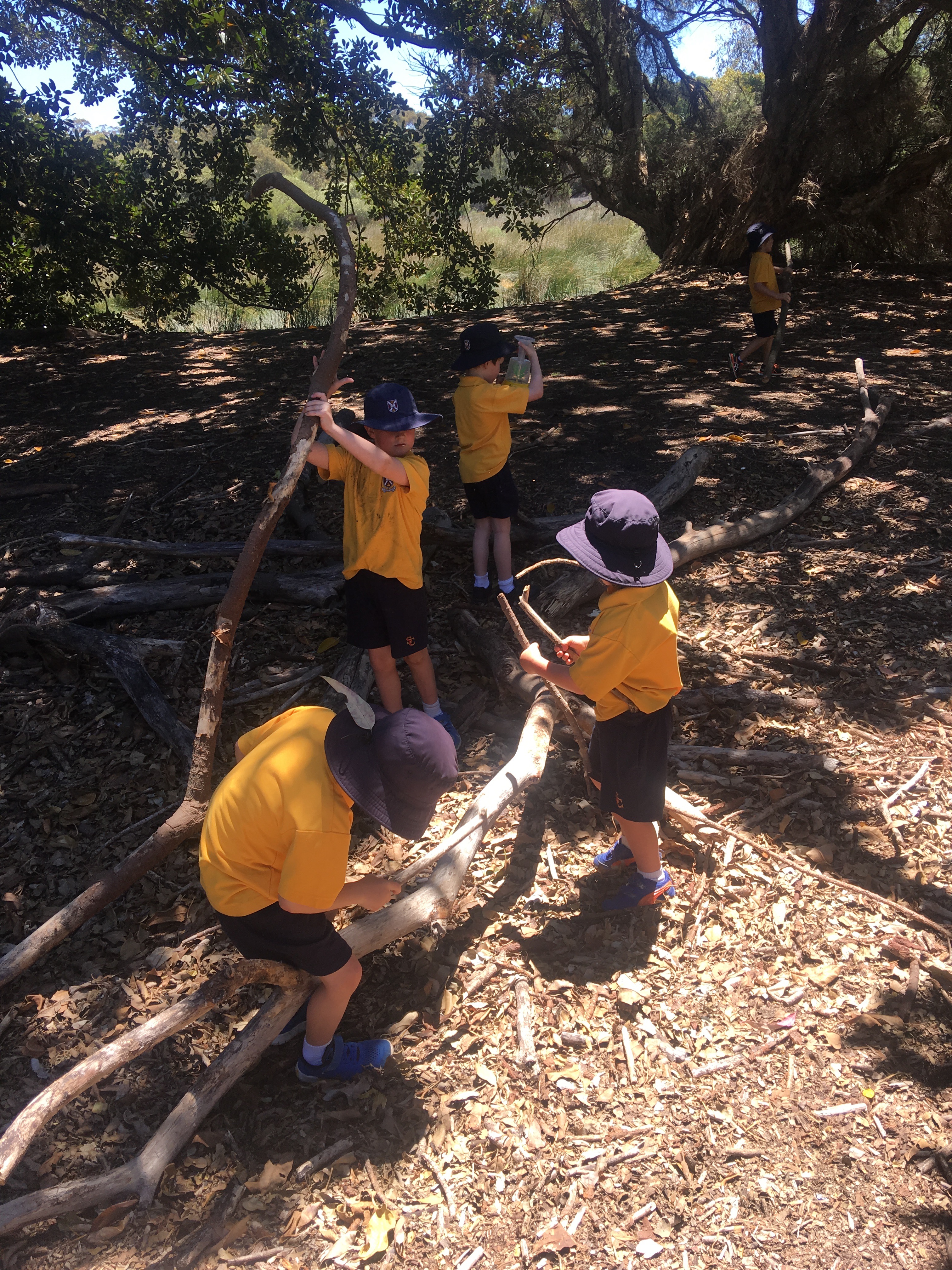 At the beginning of the year, the boys began their Bush School journey around the perimeter of the College's oval. From these sojourns, they then ventured out further to discover the changing scape of the lake. As autumn and winter set in, the lake burst to life with the water bringing an abundance of birdlife and new foliage. Spring has brought immeasurable riches such as woodworms tucked under the tufts of the paper bark trees, exo-skeltons from insects long departed and glistening webs which we emulated with string between trees. The engagement and pure joy the boys experience when they are out in nature is almost indescribable. When the boys are out at Bush School they negotiate, share and dialogue using the wonderfully rich language.